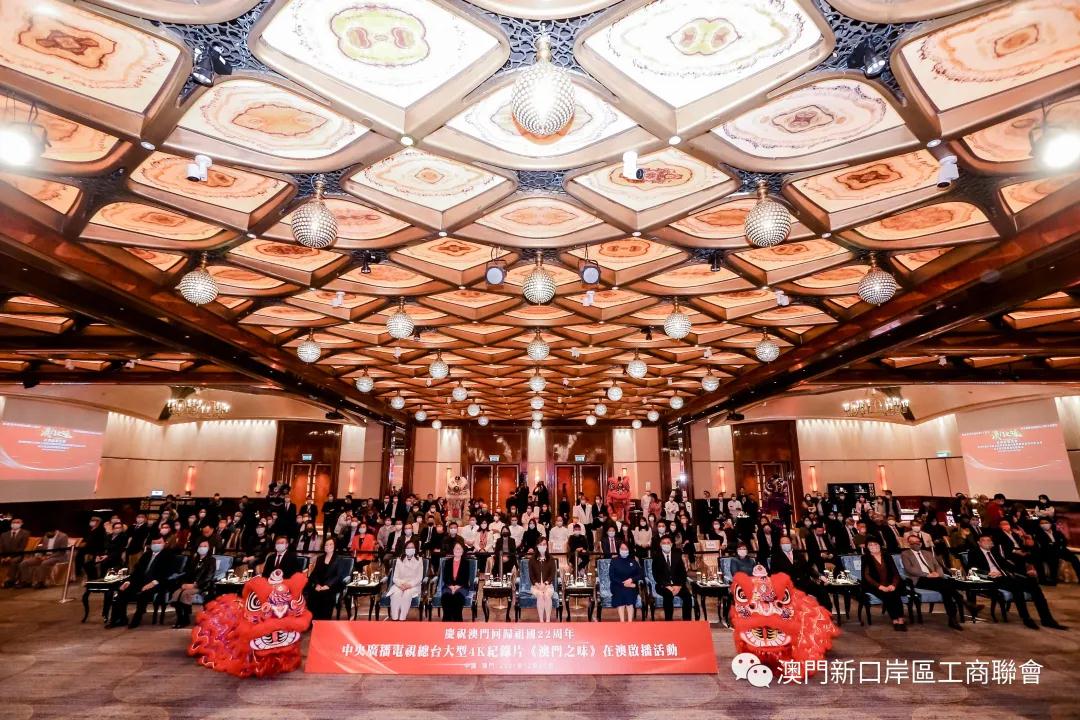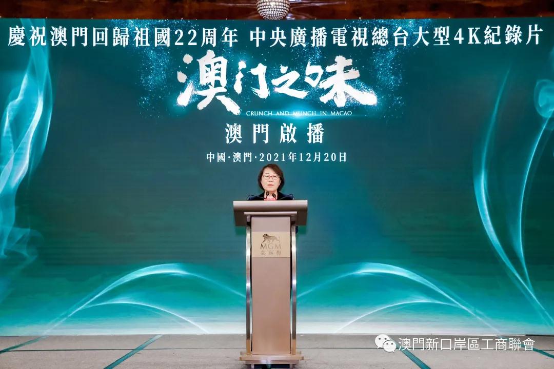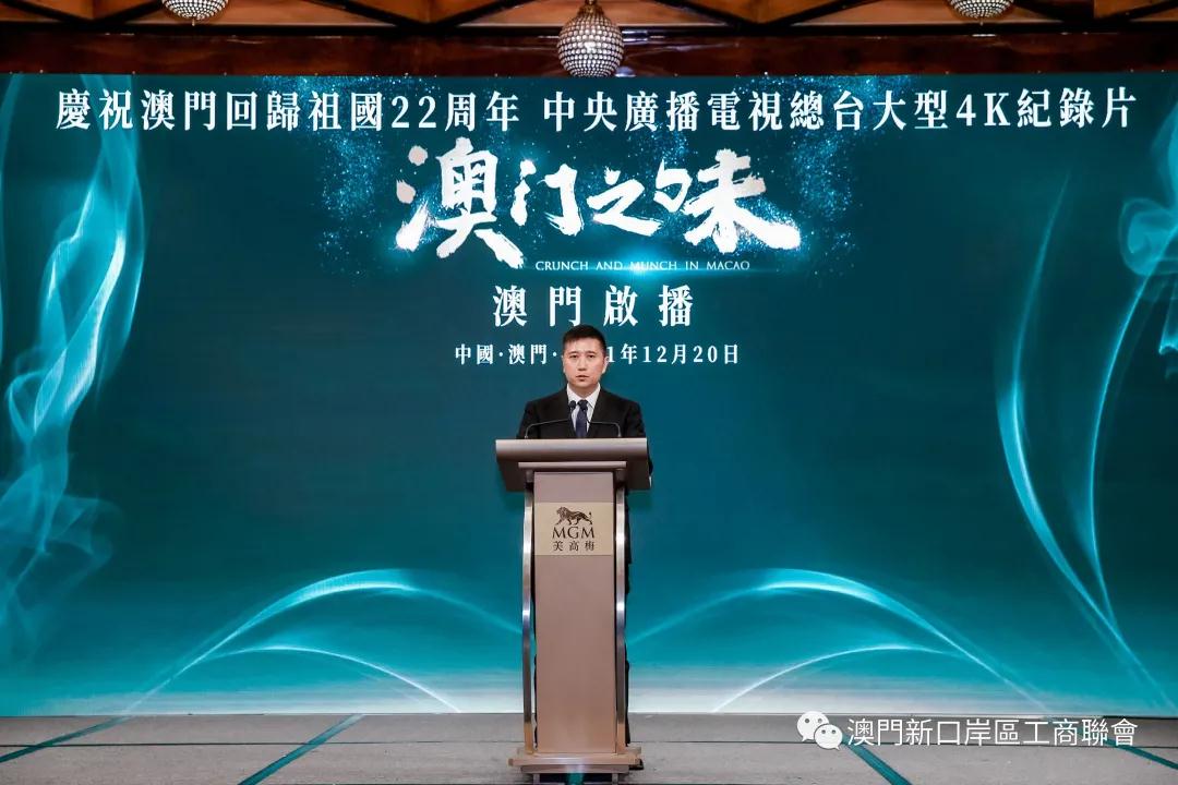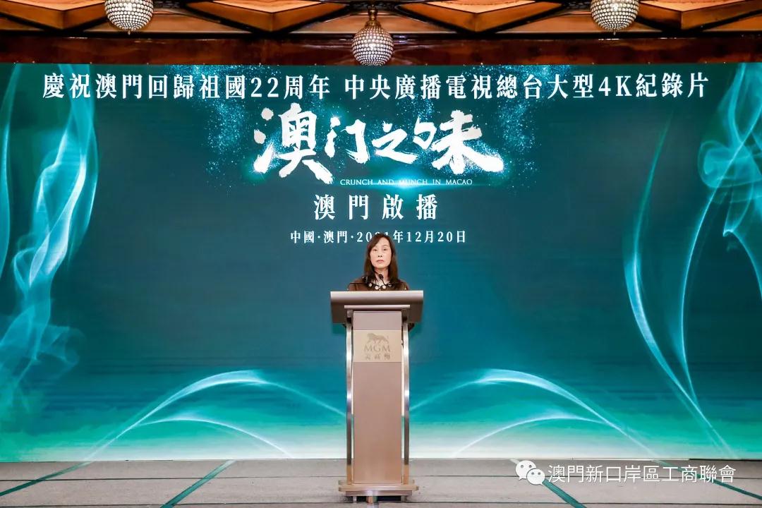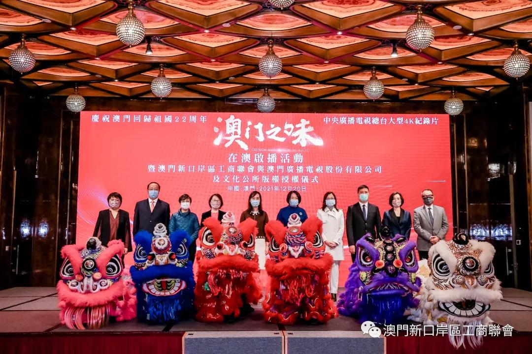 为庆祝澳门回归祖国22周年,由中央广播电视总台与澳门新口岸区工商联会联合制作的大型4K纪录片《澳门之味》12月20日在澳门隆重举行启播仪式。澳门特别行政区政府社会文化司司长欧阳瑜、中央人民政府驻澳门特别行政区联络办公室副主任严植婵、中央广播电视总台影视剧纪录片中心副主任兼《澳门之味》监制梁红等各界嘉宾近百人出席活动。