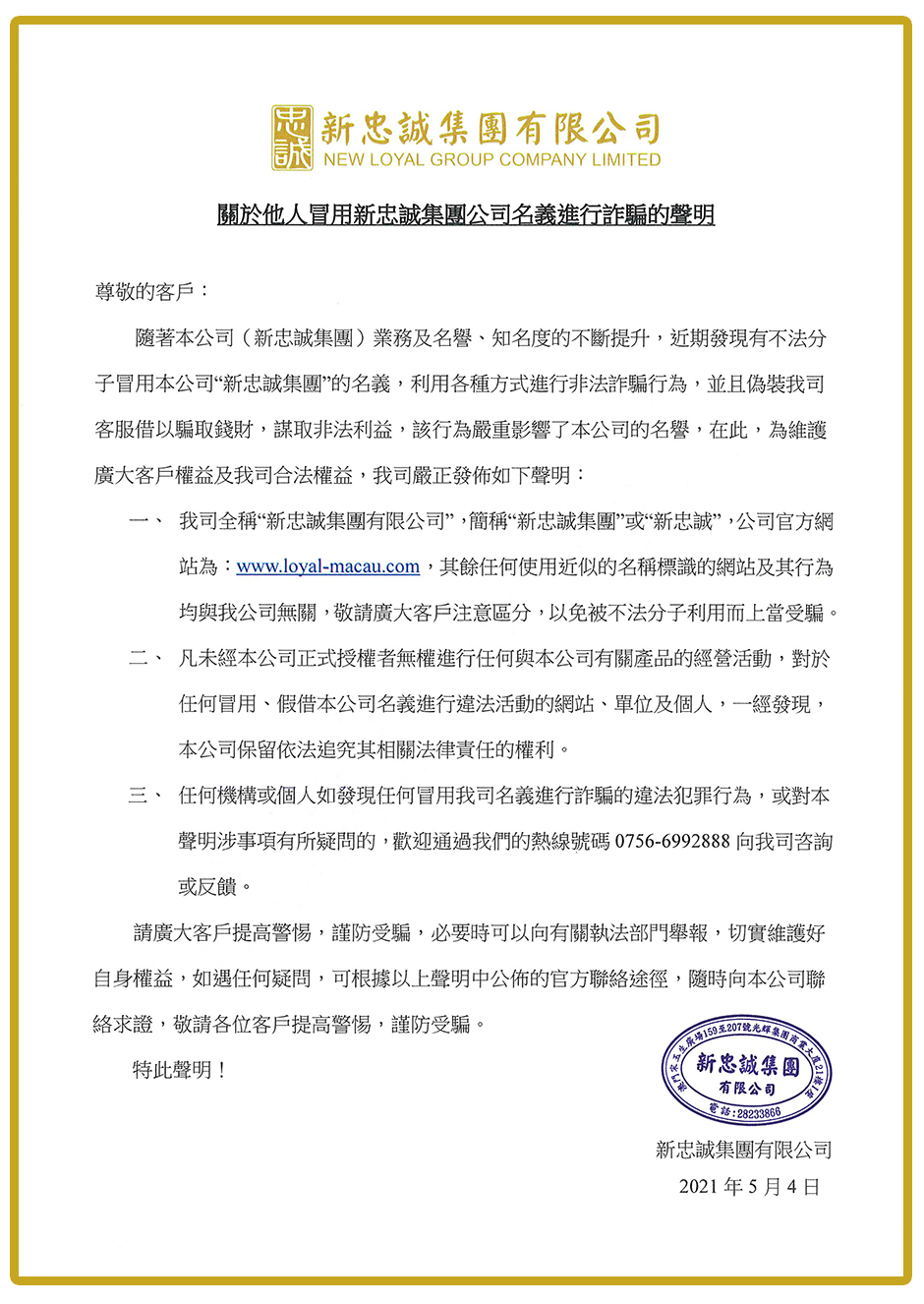 三、 任何机构或个人如发现任何冒用我司名义进行诈骗的违法犯罪行为,或对本声明涉事项有所疑问的,欢迎通过我们的热线号码0756-6992888向我司咨询或反馈。